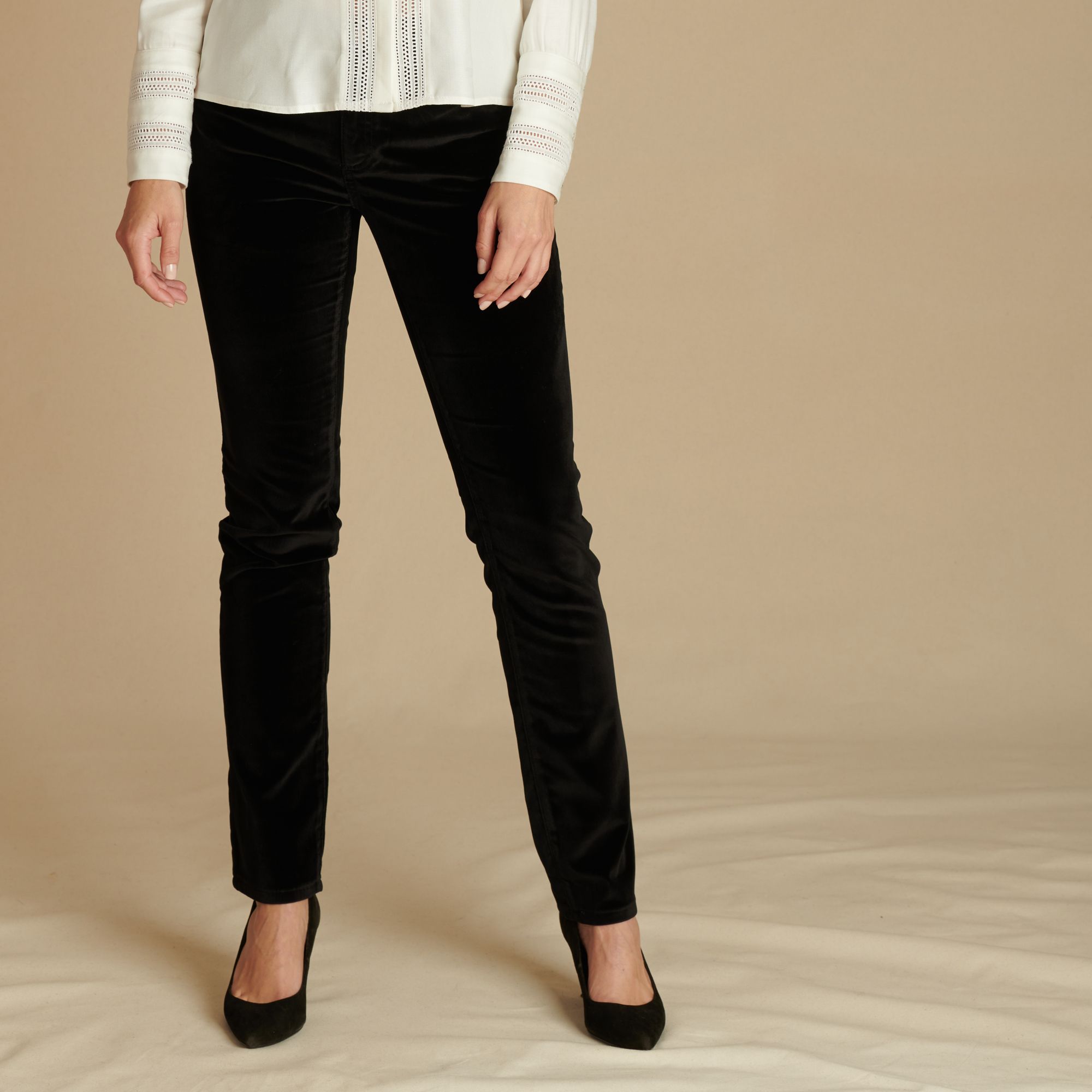 Our beautifully cut black velvet jeans have been carefully designed to flatter the female form. The waistband sits on the true waist, and there is a distinct lack of clutter to create a clean silhouette. The perfect addition to any wardrobe.