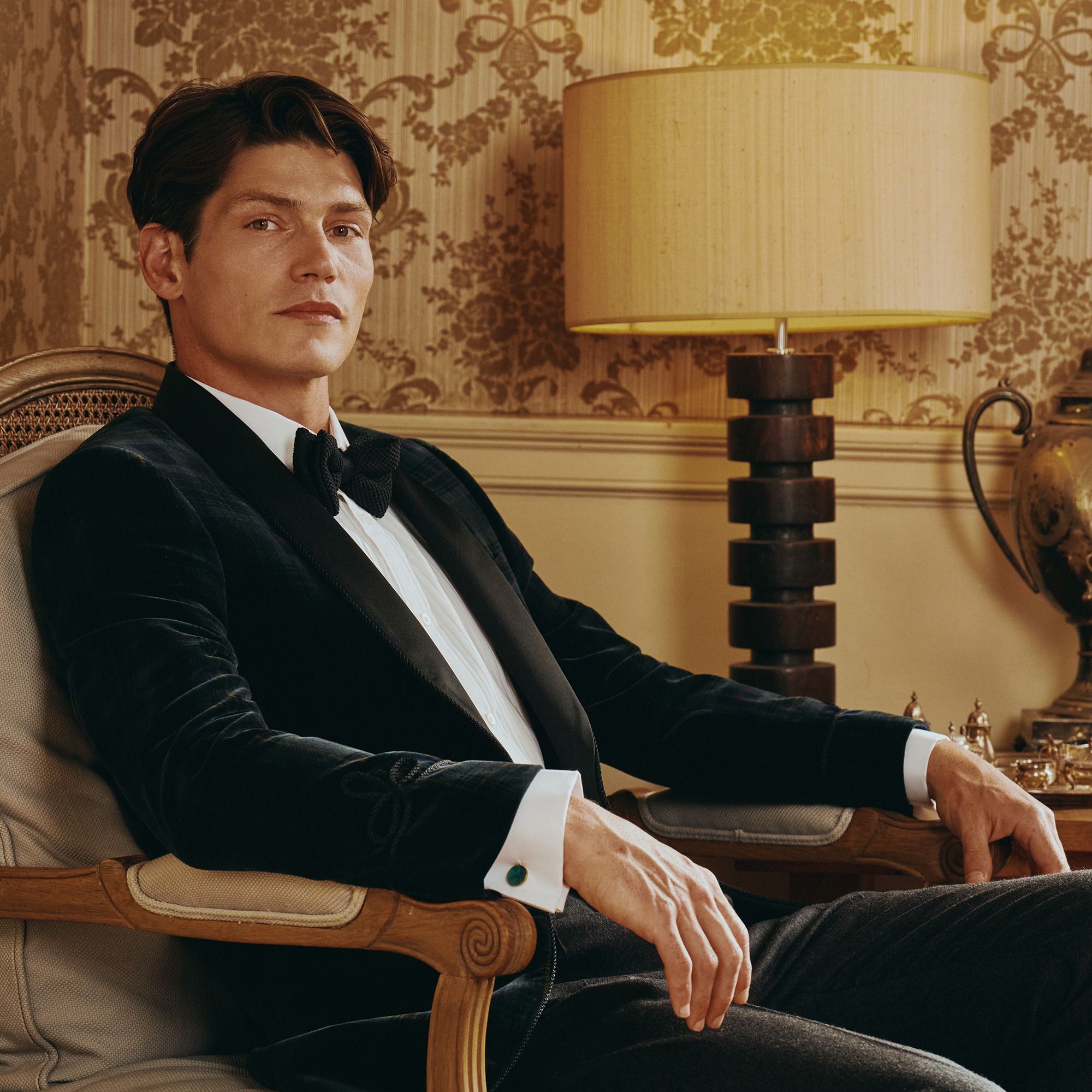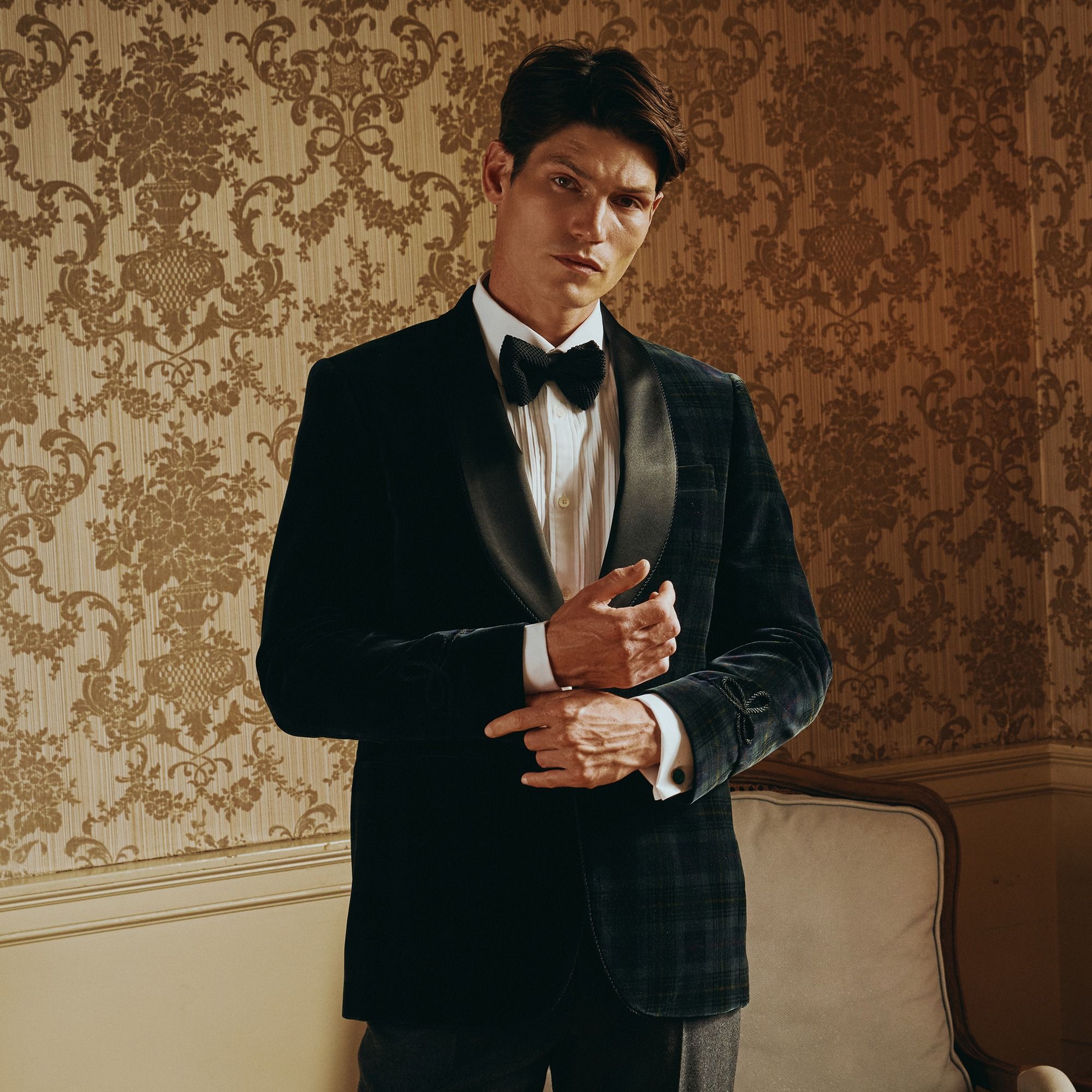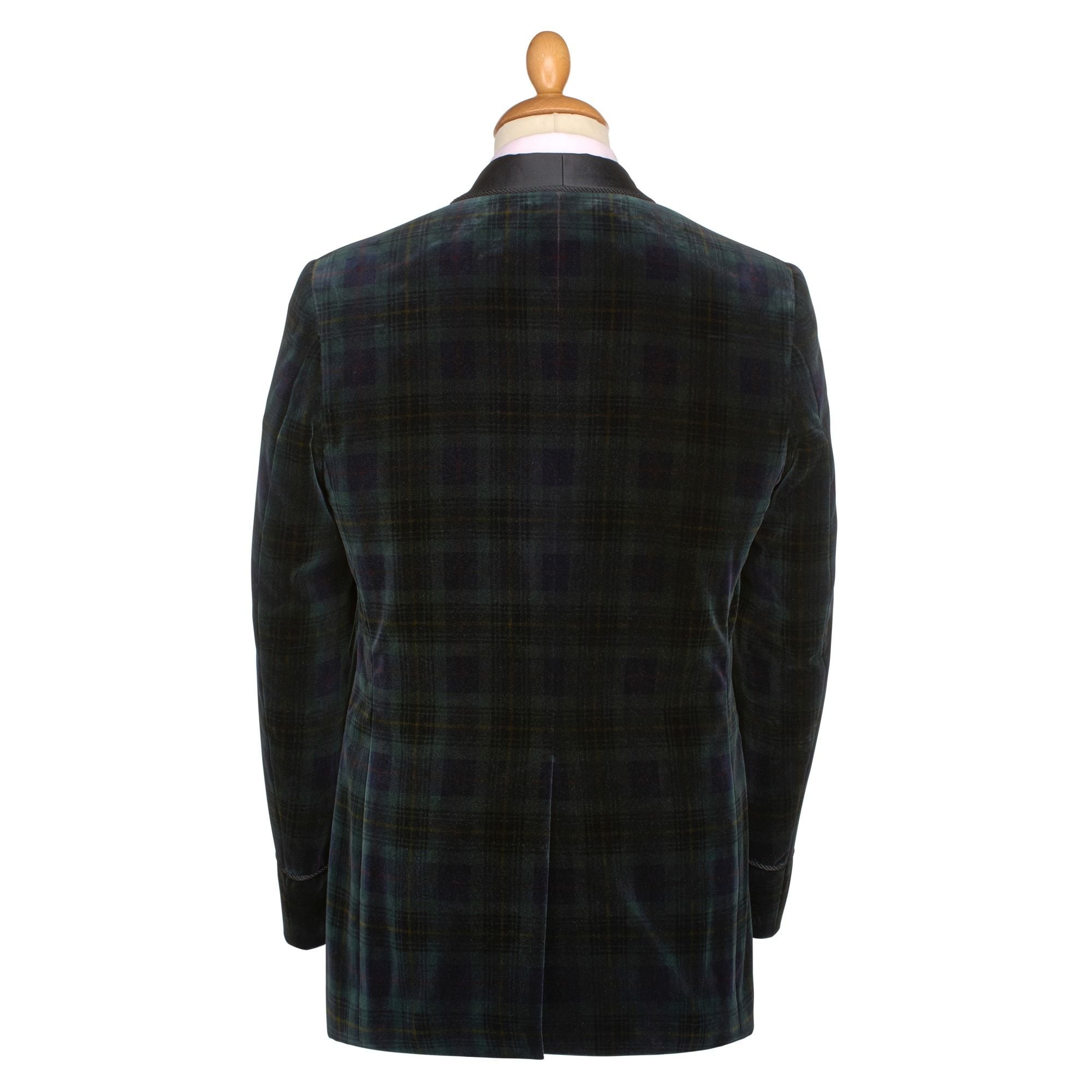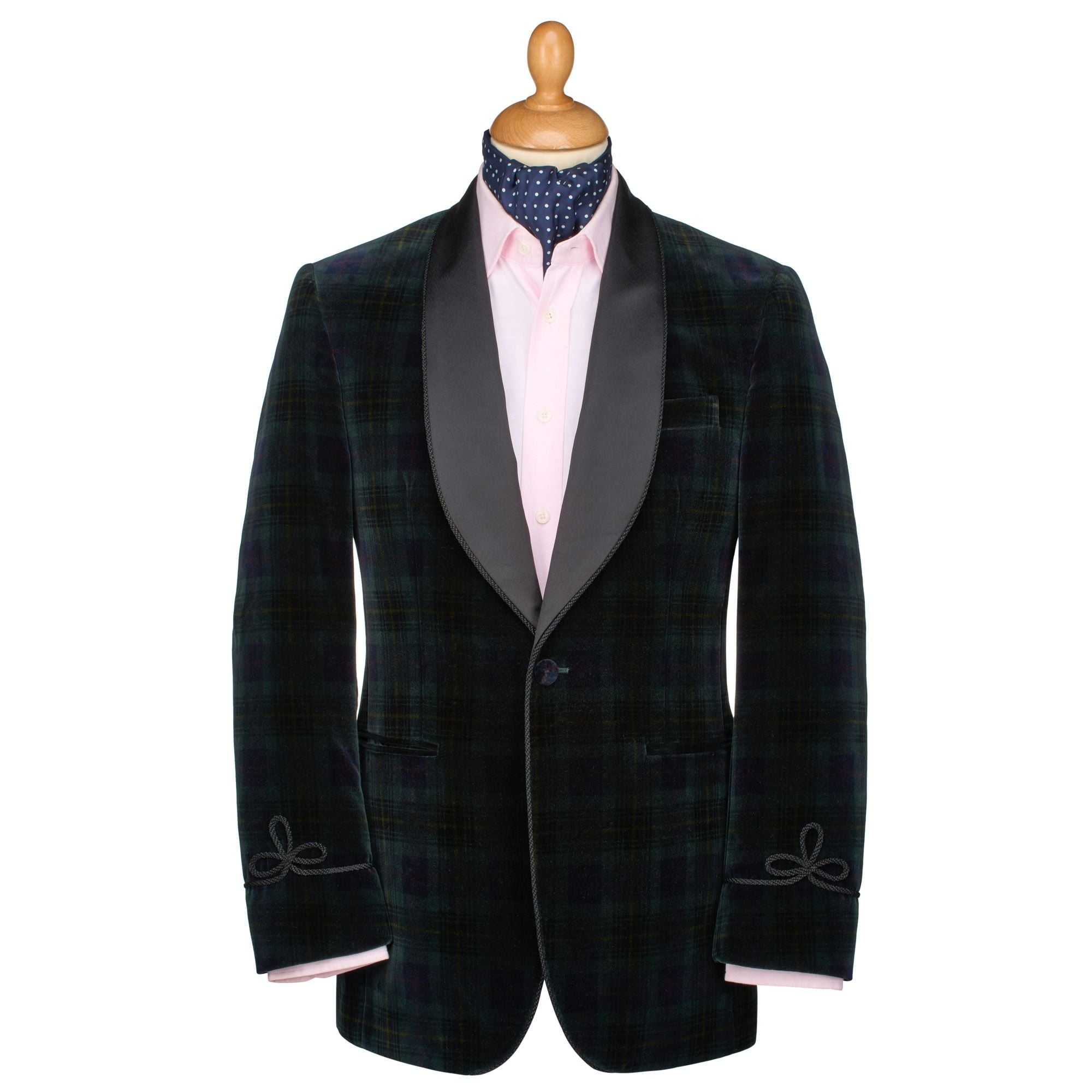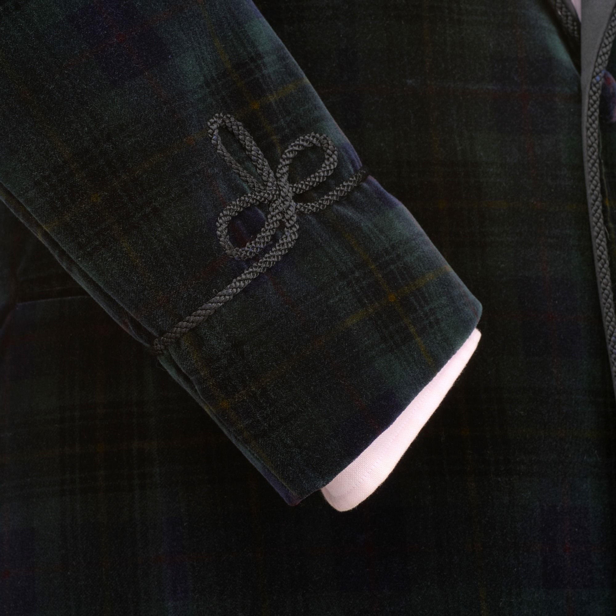 Our Black Watch Smoking Jacket reimagines this classic in a distinguished tartan velvet. Tailored in pure cotton velvet, it features the deep green and navy hues of the iconic Black Watch check, accented with traditional hand-finished frogging and a full lining. Combining heritage pattern with luxurious texture, it is a timeless piece designed to bring character and refinement to evening occasions.