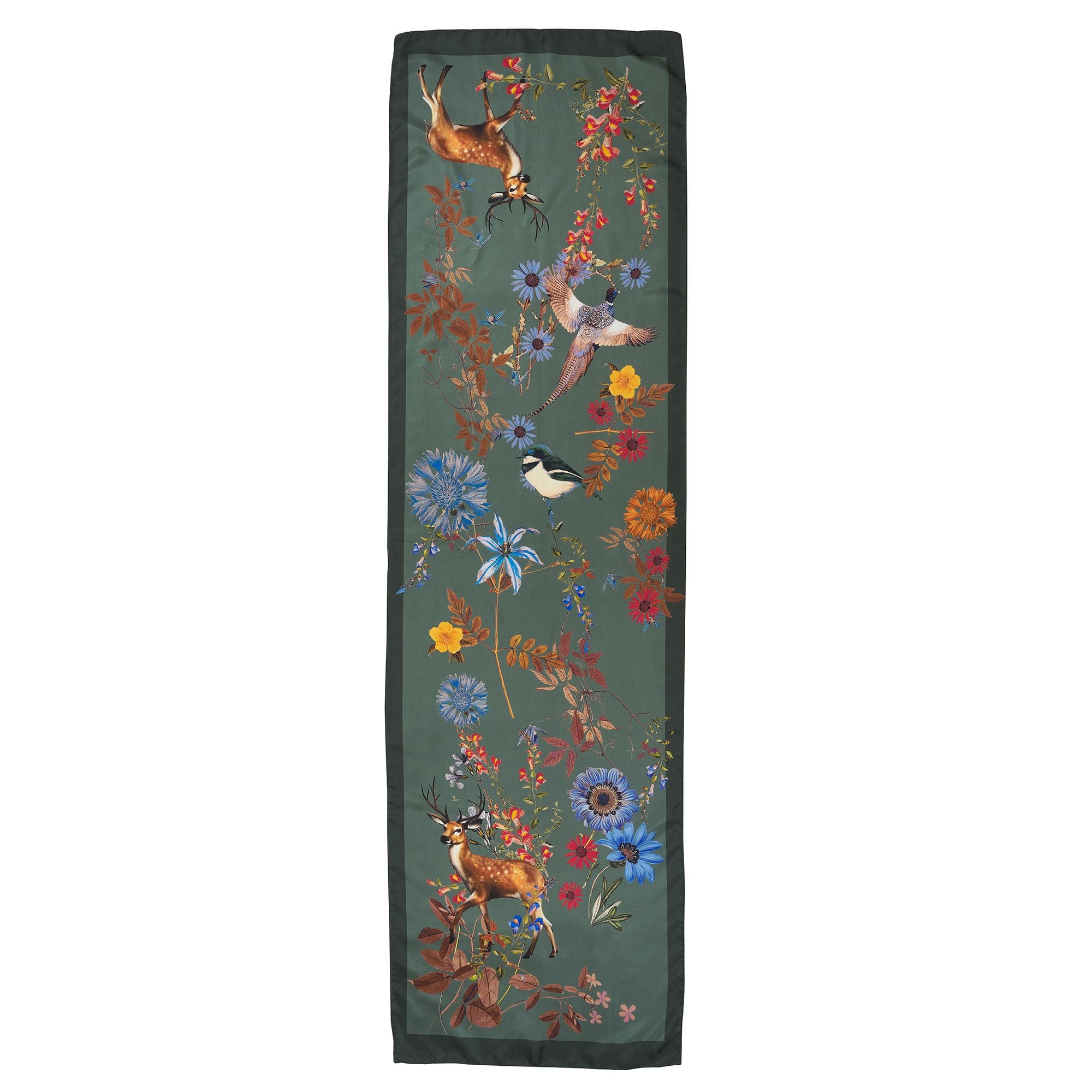 Our pure silk scarf has a charming bucolic design, featuring stag and floral motifs. It measures a generous 153cm x 43cm and is guaranteed to add a touch of class and style to any outfit.