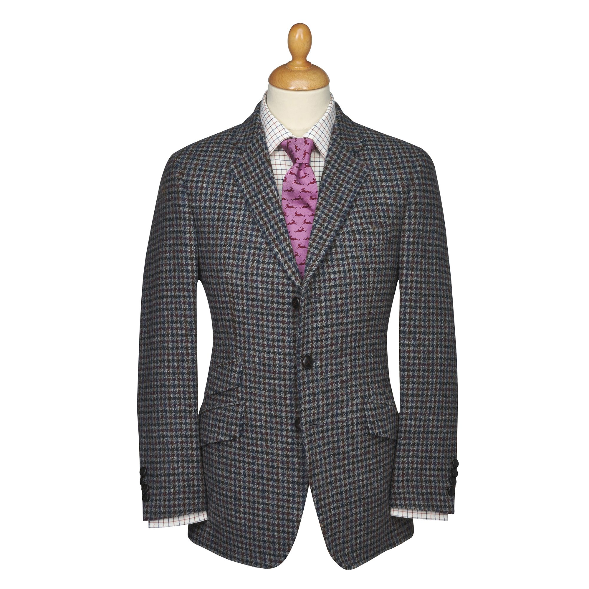 Tailored in a hand loomed tweed, woven exclusively for us by Harris. In a soft granite grey / blue dogtooth design, echoing the breathtaking landscape in which it was woven.