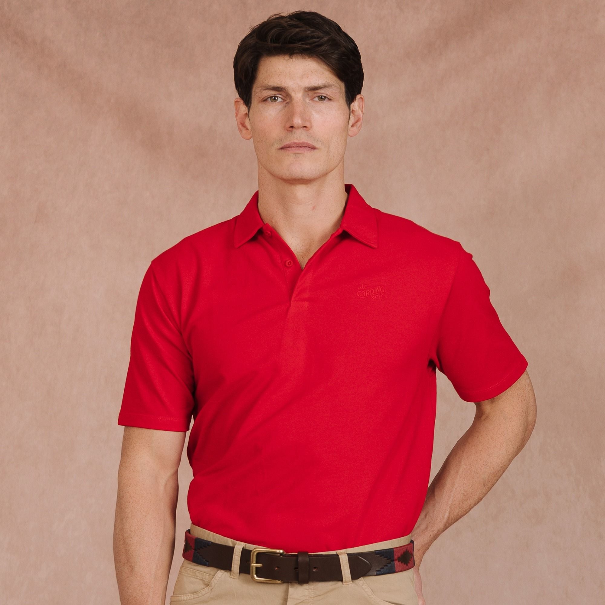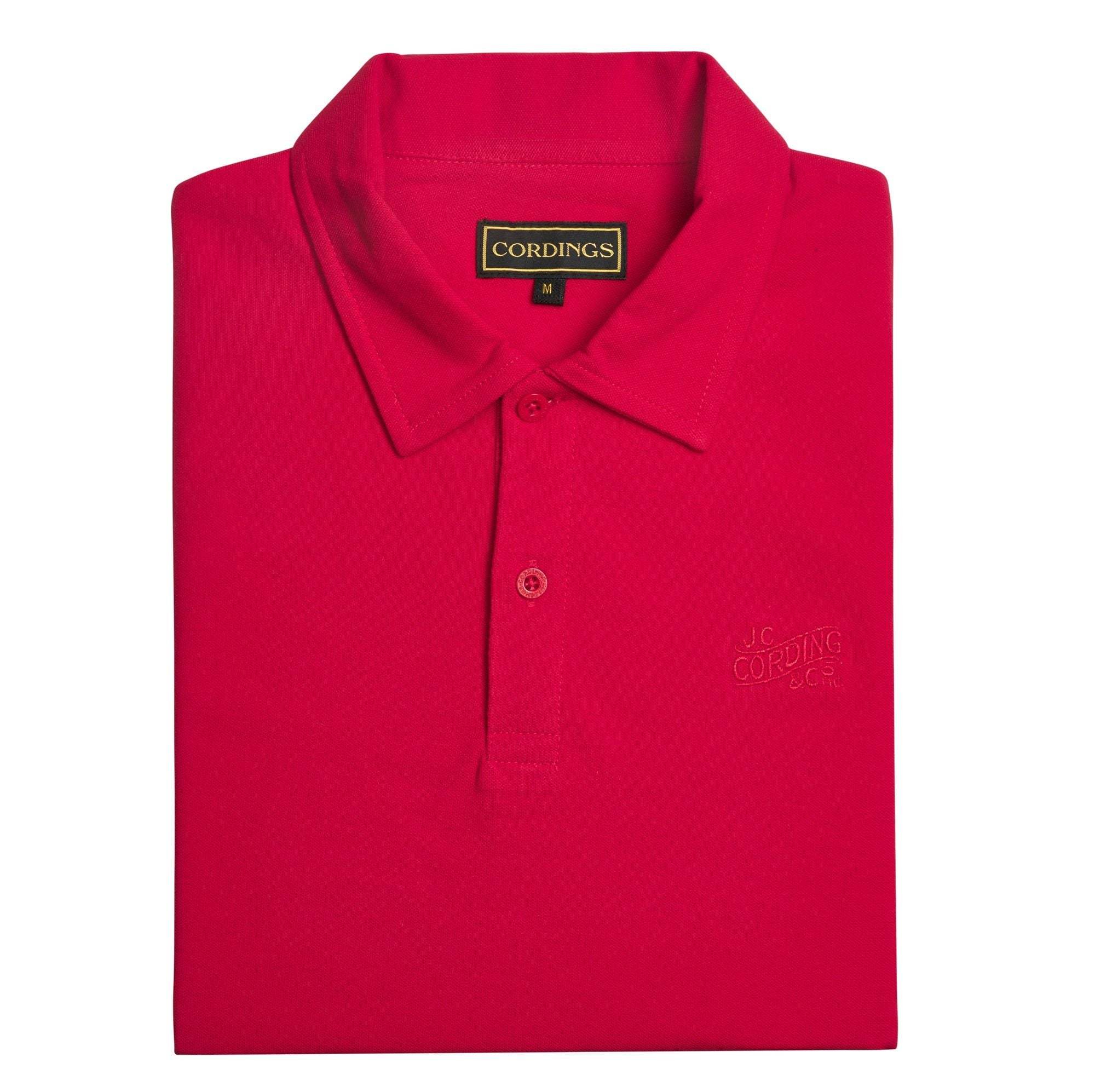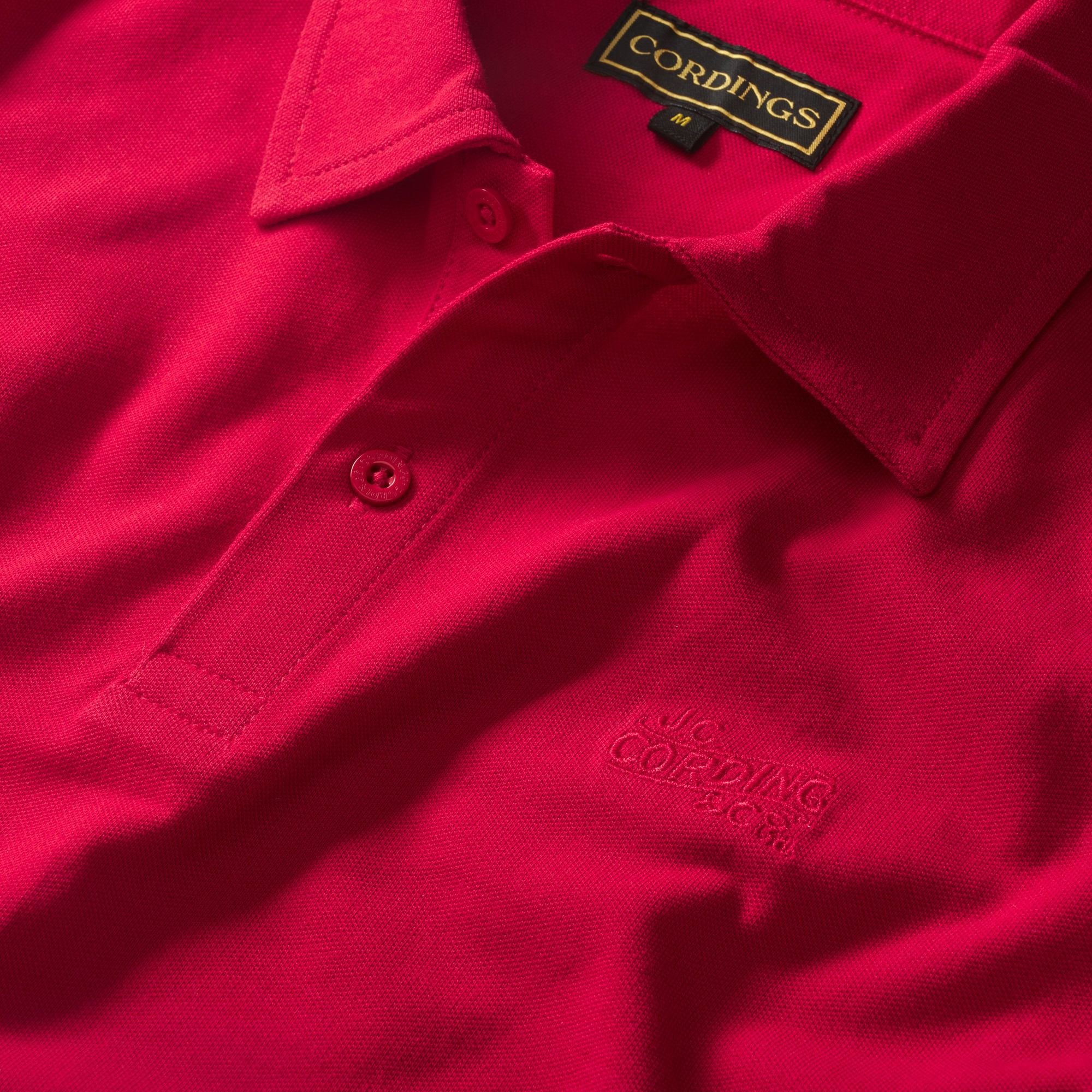Crafted from superfine pure cotton and knitted in a fine micro pique, this men's polo shirt comes in a rich red hue. Designed for a relaxed yet functional fit, it is a versatile staple for your off-duty wardrobe. True to Cordings' signature style, it features a discreet tone-on-tone Cordings logo.