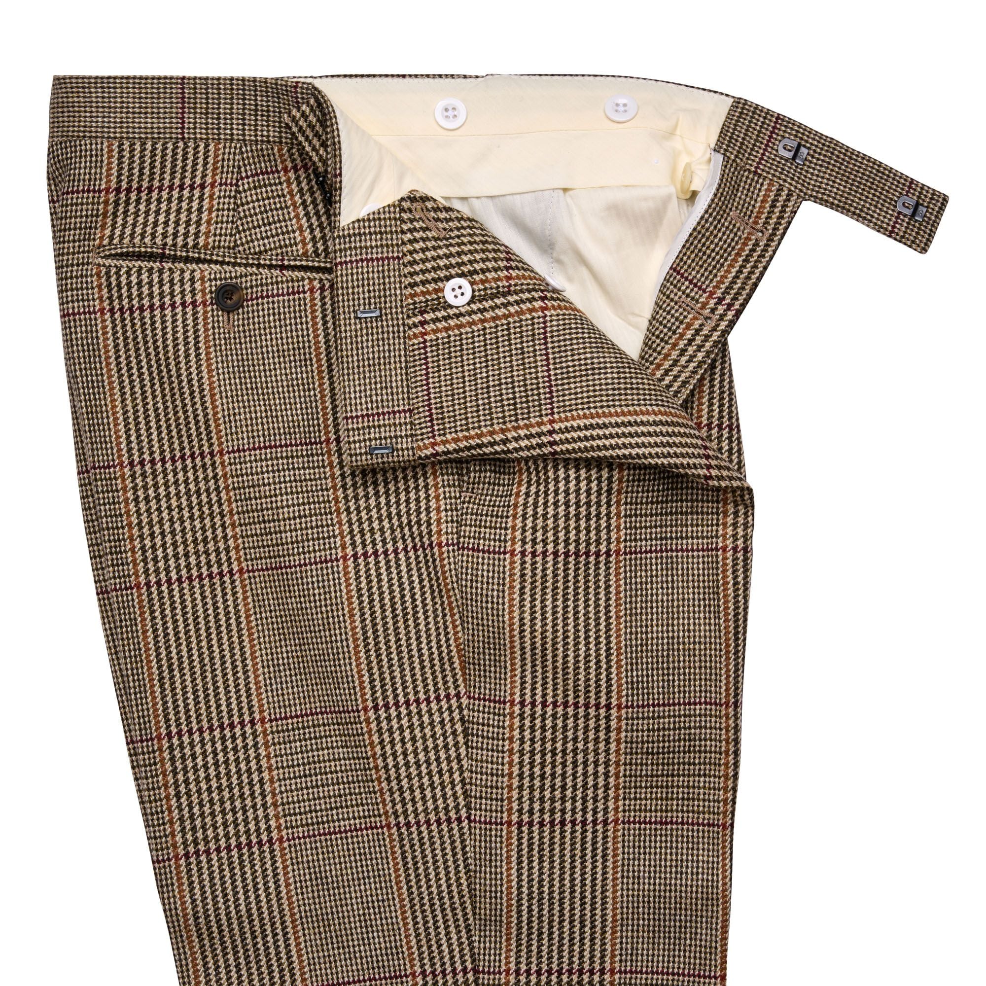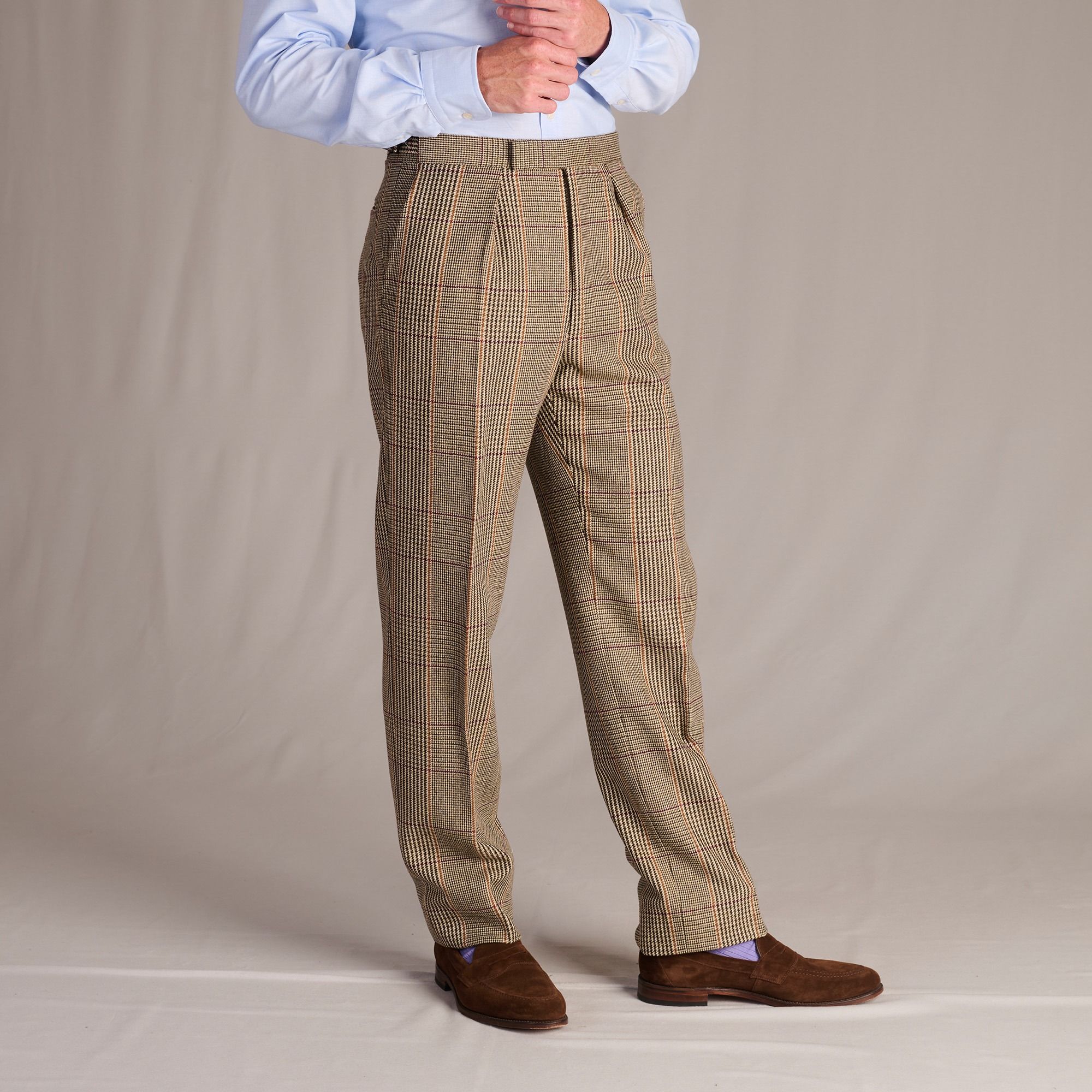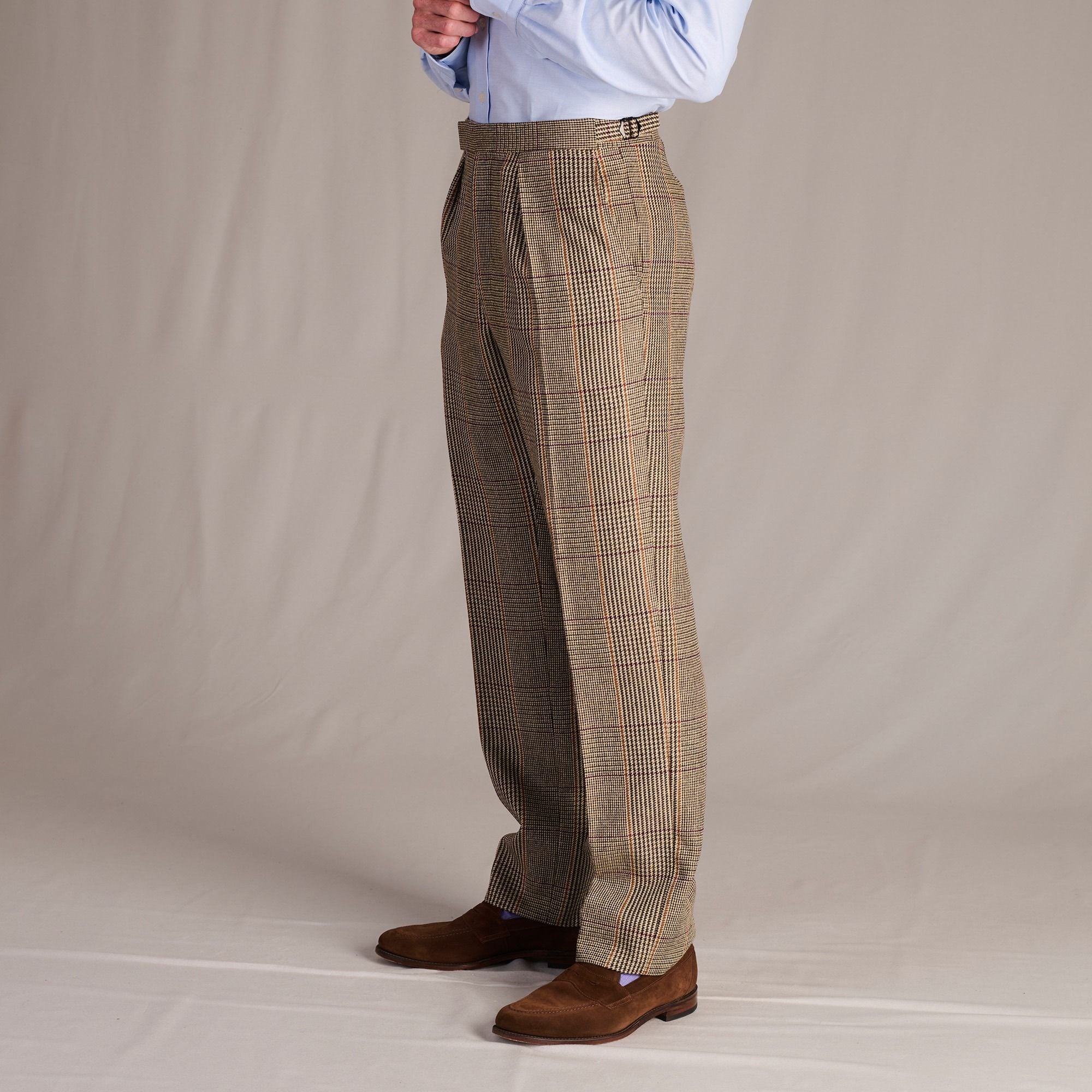 Cut from a distinctive check cloth woven in Scotland, the Russell Check Trousers are tailored from a robust 18oz (550gsm) pure wool, offering warmth, structure, and a refined drape. Designed with a plain waistband and tunnel‑top side adjusters for a clean, belt‑free fit, they feature a pleated front, button fly, and hook‑and‑bar fastening for classic tailoring detail.