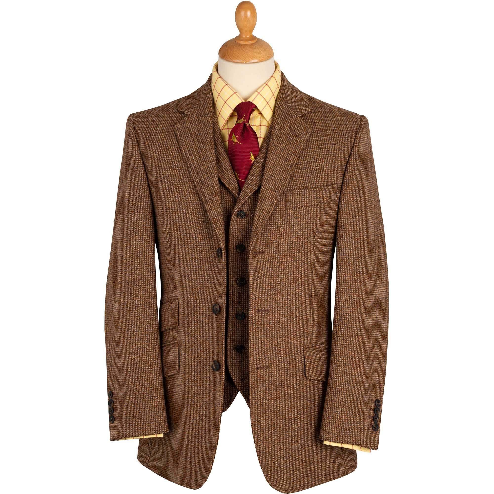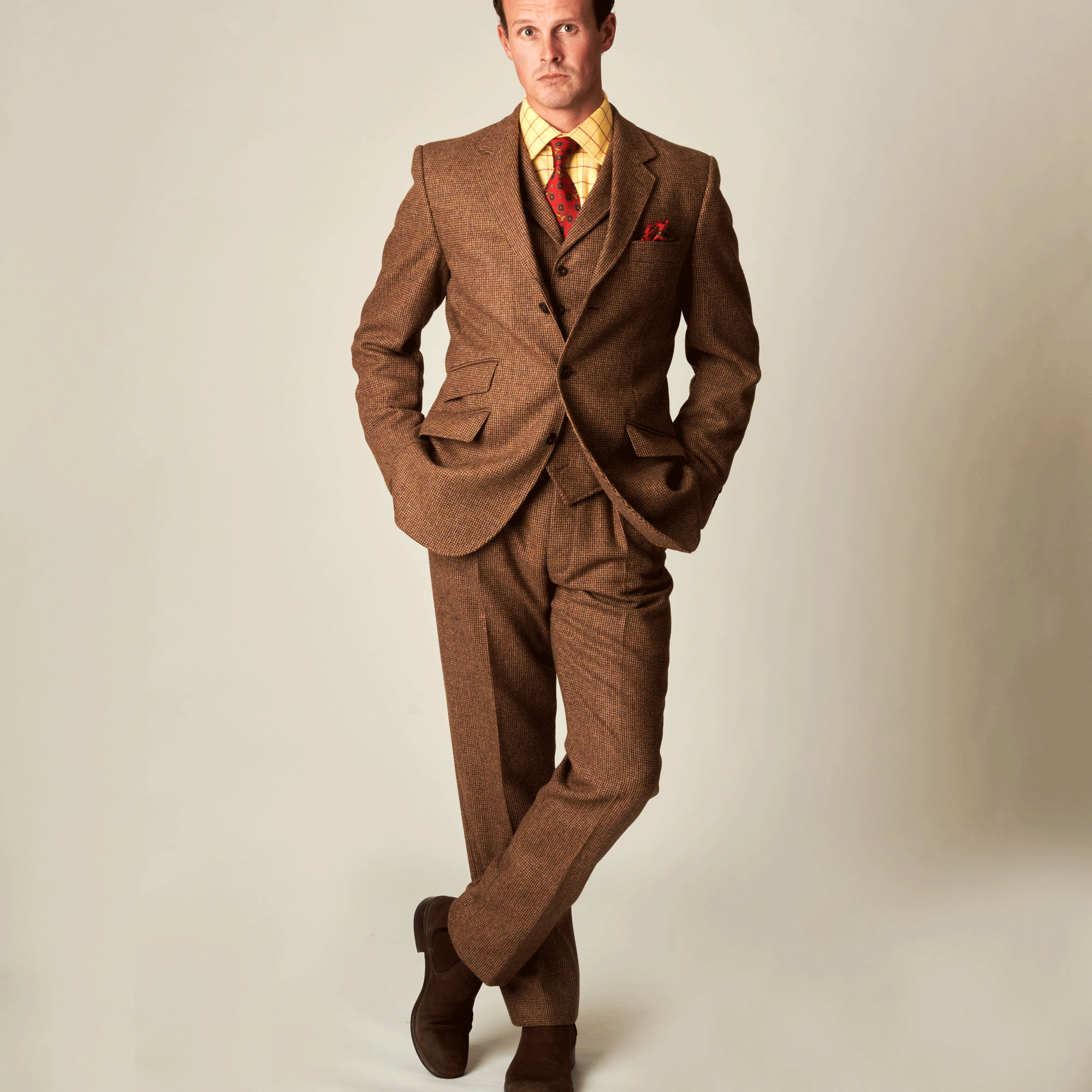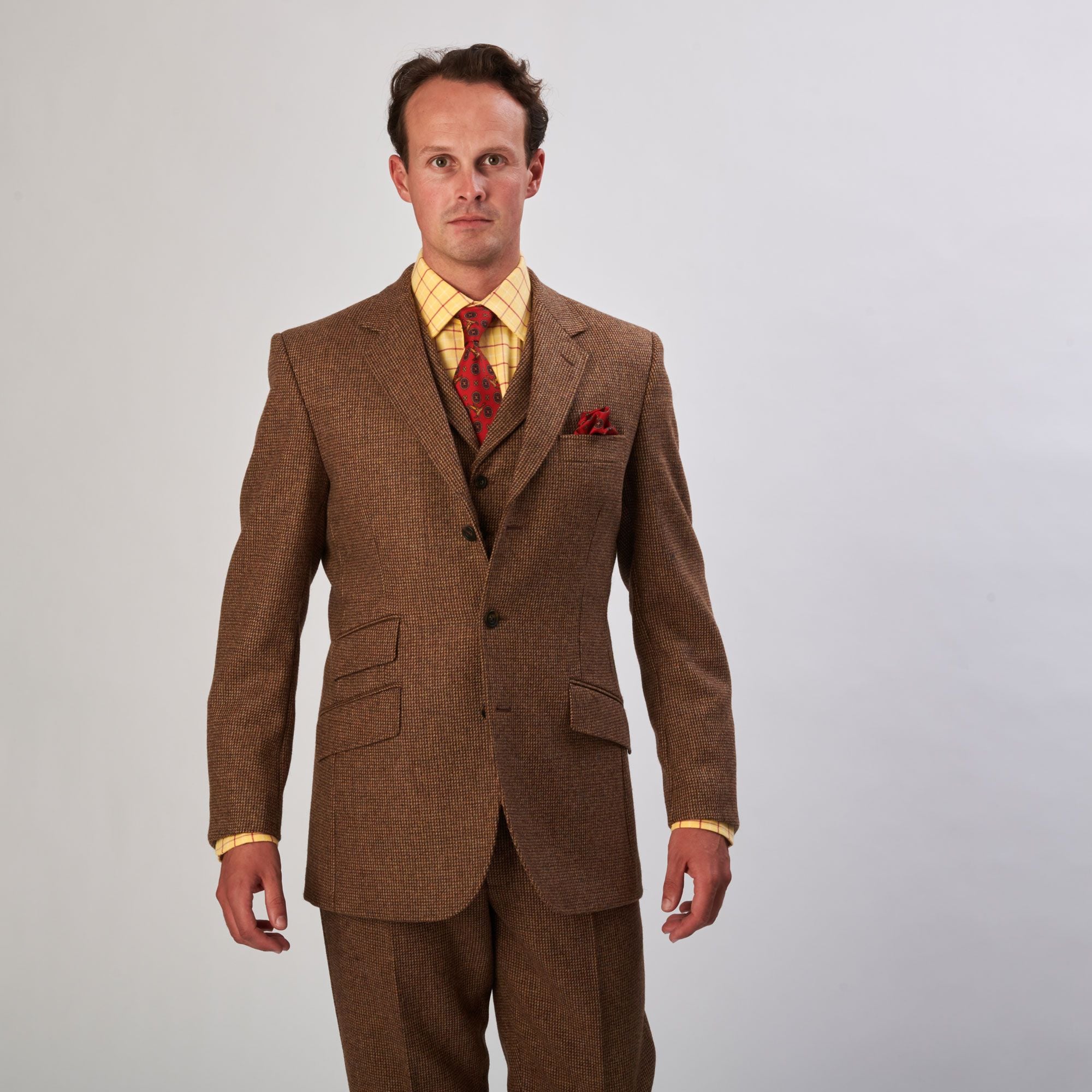 The brown hunting tweed jacket, a Scottish-woven, 100% wool masterpiece weighing 21oz. With a three-button front and single back vent, it exudes timeless elegance. A Cording's favourite that gets better with age. team together with matching trousers and waistcoat for a smart 3 piece suit or plus 2's for an alternative shooting suit.