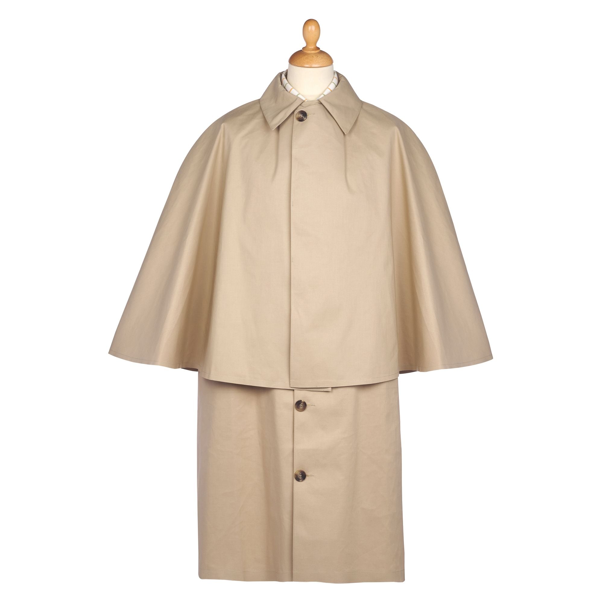 Exclusive to Cordings the Inverness Mackintosh Cape was originally sold by John Cordings in 1839 and worn by gentlemen on horseback, in the field or in early motor vehicles. Our modern day version has original features such as arm straps and throat tab and is as practical today at withstanding the elements as it was nearly two hundred years ago . Individually hand made in Scotland by craftsmen using methods that have been applied since 1824 using rubberised cotton. A truly unique garment, owning one is to own a piece of history.