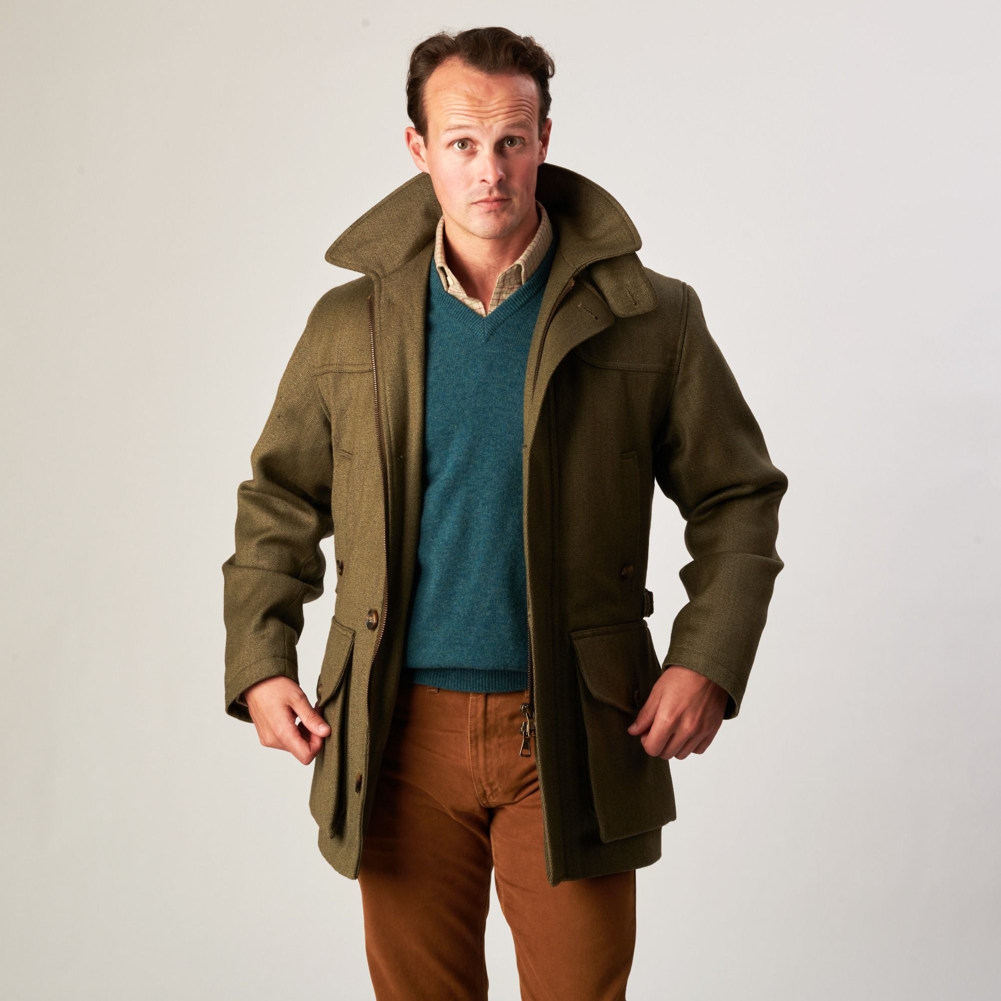 Made in Britain, our field coats are fine examples of British workmanship. Our Chepstow field coat, in a heavy 21oz keepers tweed is fully waterproof with a breathable membrane, with attention to detail that sets it apart from other coats. In a classic navy, the perfect town to country coat, equally at home over a city suit in town, or teamed with jeans and Le Chameau boots for a country walk.