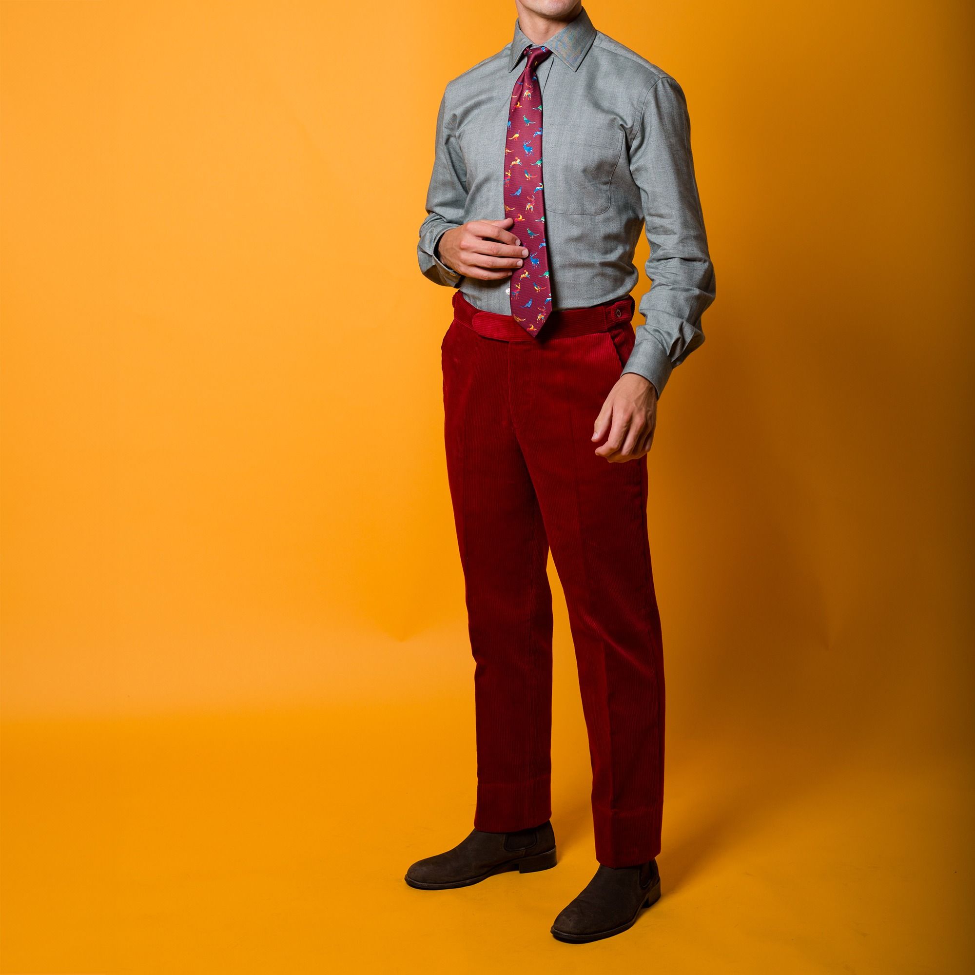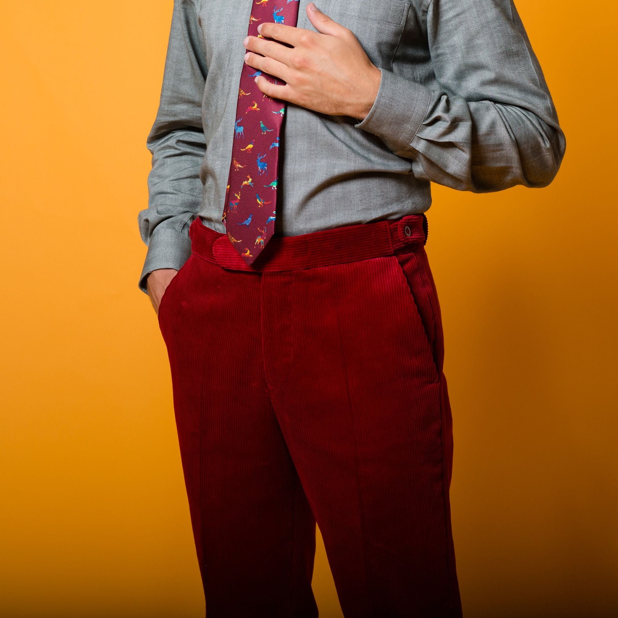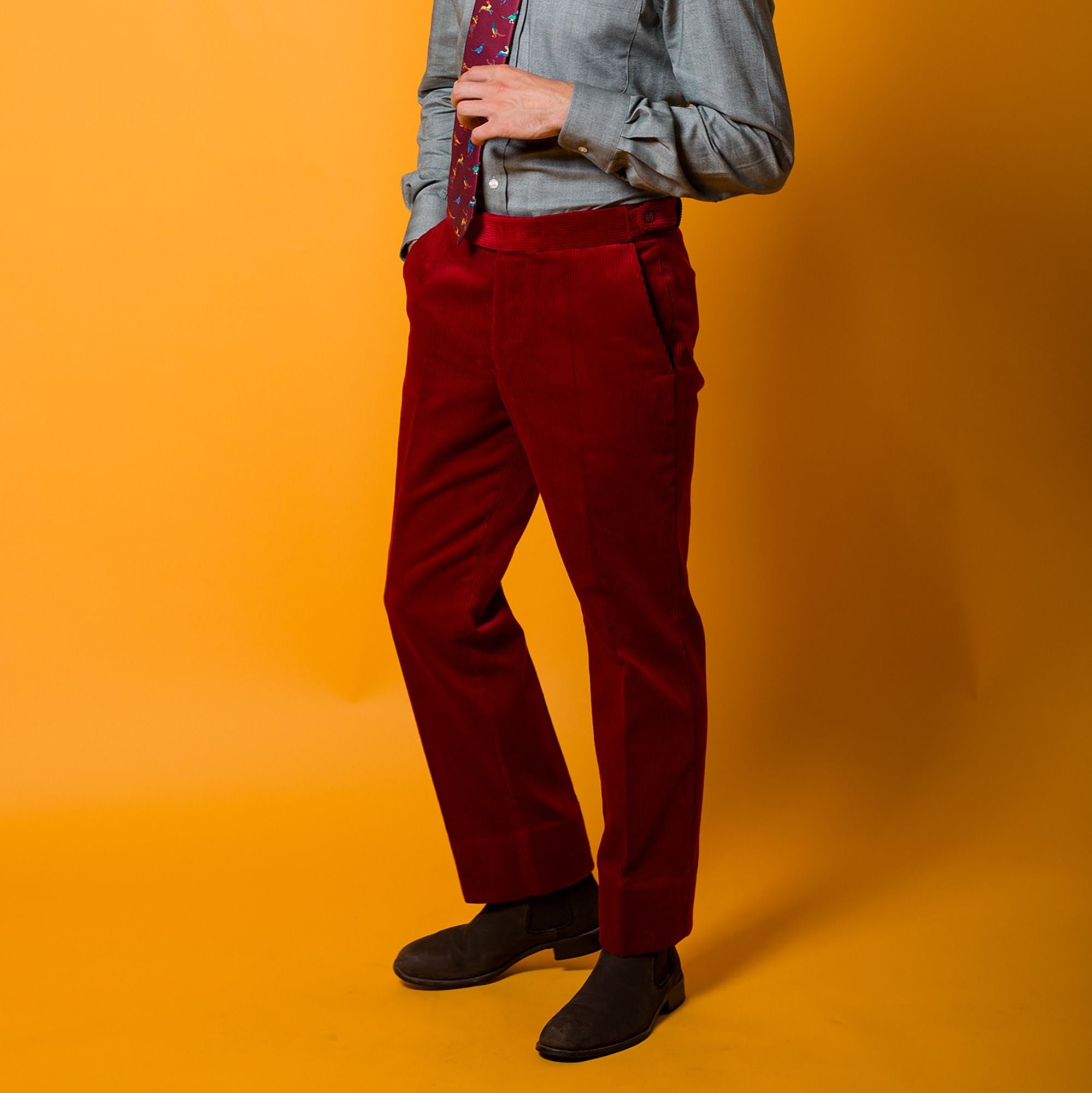 Elevate your wardrobe with our Men’s Bordeaux Red Corduroy Trousers, a stunning blend of timeless craftsmanship and modern sophistication. Made from soft yet durable 8-wale corduroy, these trousers offer unmatched comfort and only improve with wear. The flat-front cut, button fly, and adjustable side tabs ensure a tailored, refined fit while the rich Bordeaux red hue brings a bold yet classic flair, making them the perfect pairing with tweed jackets for a distinguished country look.